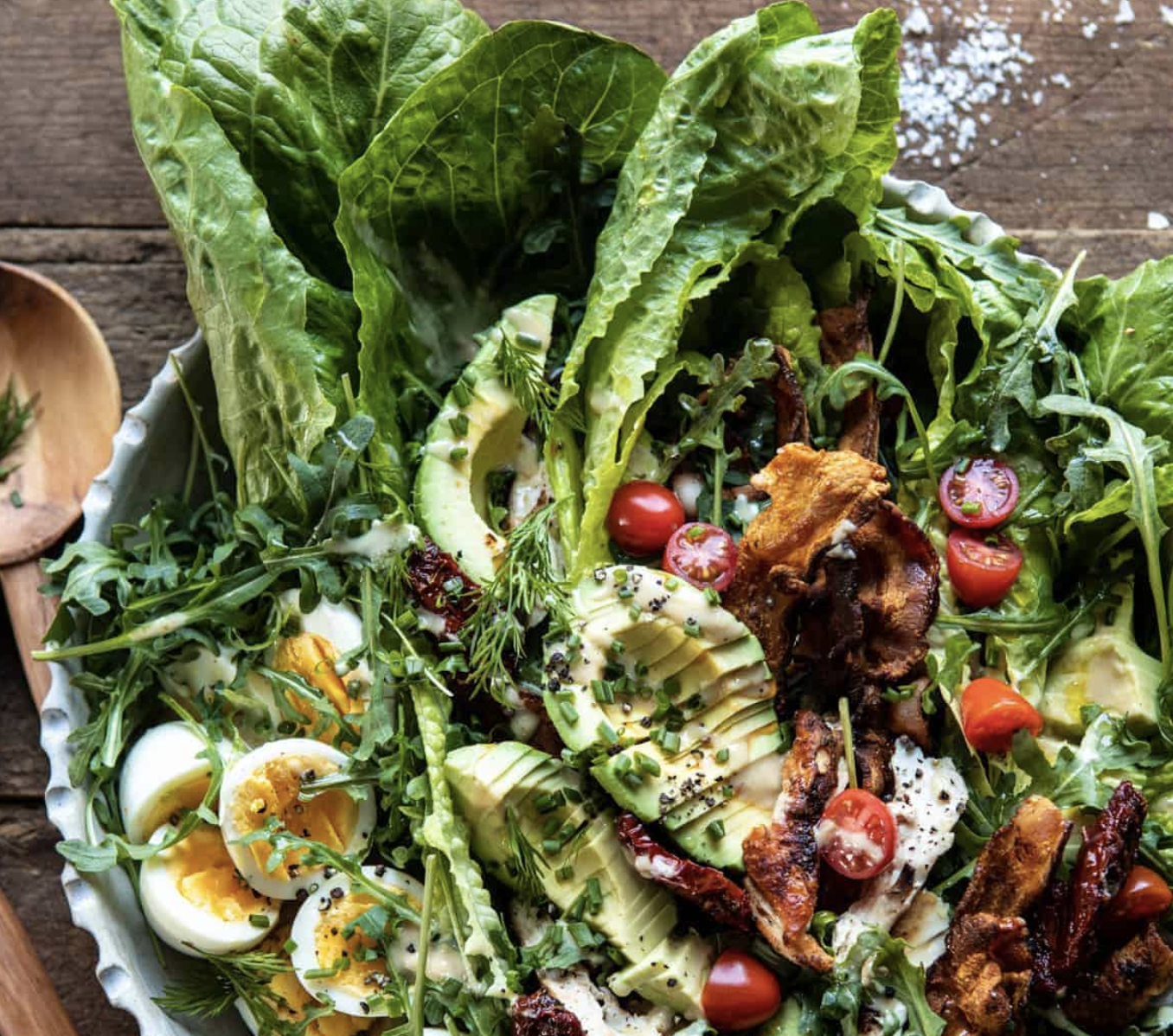 4. In a large salad bowl, combine the greens, tomatoes, and sun-dried tomatoes. Top the salad with cheese, avocado, chicken, bacon, and eggs. Drizzle/toss with tahini ranch.