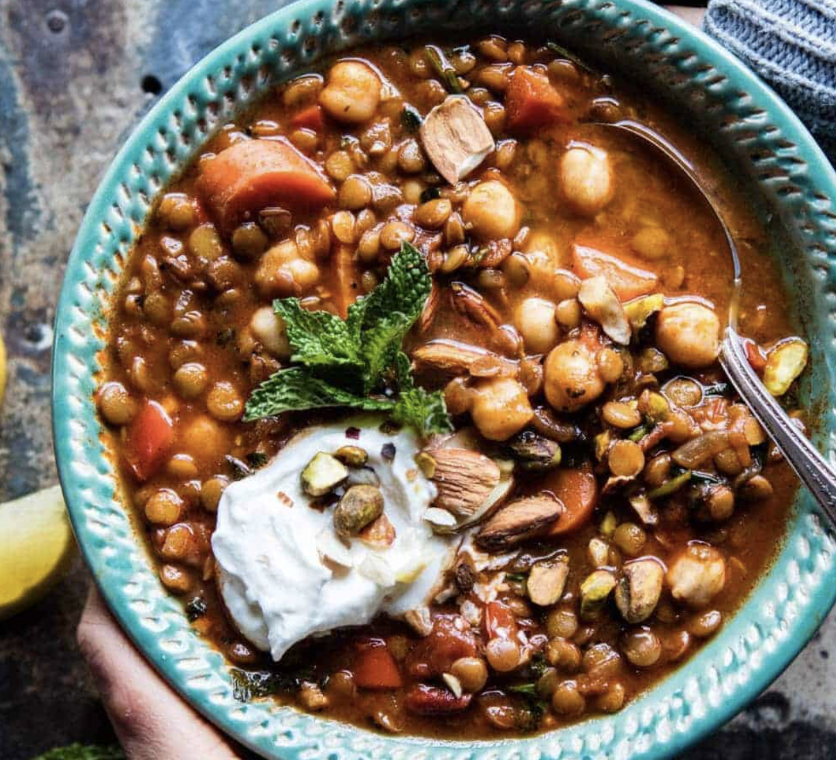 1. In the bowl of a crockpot, combine the lentils, onion, ginger, garlic, carrots, red pepper, tomatoes, veggie broth, 1/2 cup water, the harissa, paprika, cumin, cinnamon and a large pinch of both Kosher salt and pepper. Stir to combine. Cover and cook on low for 6-8 hours or on high for 4-6 hours.