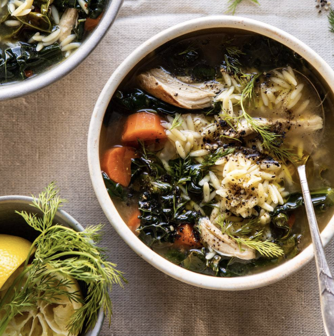 Divide the orzo among bowls and pour the soup over top. Top each bowl with fresh dill and a squeeze of lemon, if desired.